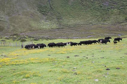 走到一處草坪,南杰和吉美下馬一起去扶雍貝,說是在此處稍作歇息。雍貝的臉色恢復了紅潤,他取下盤香枝插進吉美濃密的頭發(fā)里,兩人由此發(fā)出了嬉笑聲。馬兒徑自走向草坪深處的水洼里飲水,打著酣暢的響鼻,頸項上銅鈴鐺隨馬兒鬃毛的抖動發(fā)出了“鐺鐺”的聲音。馬兒飲飽了水,轉(zhuǎn)身朝我們走來。繼續(xù)騎行,不知過了多久,日光在頭頂上游移,漸漸偏西。雍貝在前方問南杰,阿尺,巴烏牧場還有多遠?南杰指向眼前的山峰說,登上這座峰頂就到了?;赝宦方?jīng)過的河谷,早已不知去向,我們身處的位置幾乎與周遭巍峨的山巒平齊了。我從衣兜里取出手機測試海拔高度,4820米。
