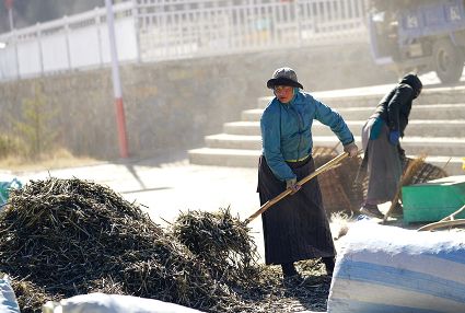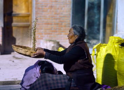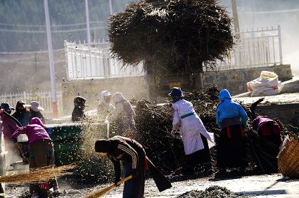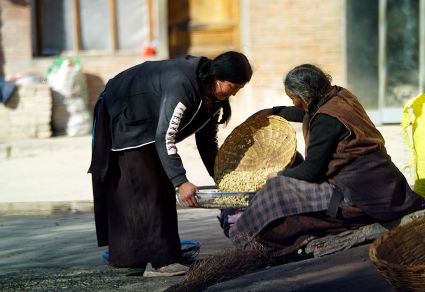 一群孩子會準(zhǔn)時來小二樓叫我,要去密林,要去山岡,要去尋找?guī)в薪?jīng)文的瑪尼石,還要去那個神秘的洞頂。比孩子們更準(zhǔn)時的是掛在小二樓上的四個大喇叭,鳥雀剛醒來,廣播就開始了,就必須要起來了。穿過巷道,和打豆子的人們一起享受勞動的幸福。我們在一起,等待著下午的廣播,因?yàn)閺V播會給我們帶來無盡的喜悅。