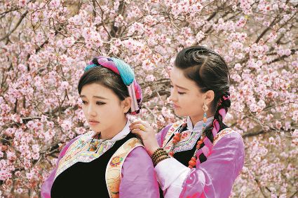 藏家小伙坐于桃樹(shù)下,輕奏馬尾胡琴,姑娘們輕揚(yáng)水袖,柔軟弦音的輕歌曼舞與繽紛落英相融一體。