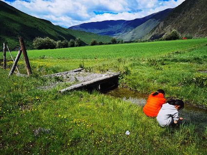 一處處水洼,清冽透亮,遠處的花樹、房屋在水面的倒影隨微風輕輕蕩漾,水里,蝌蚪在草間嬉戲,水邊,身著彩衣的孩童駐足玩耍,羨慕她們的童年,更羨慕她們的童年在這樣如畫的美景里。
