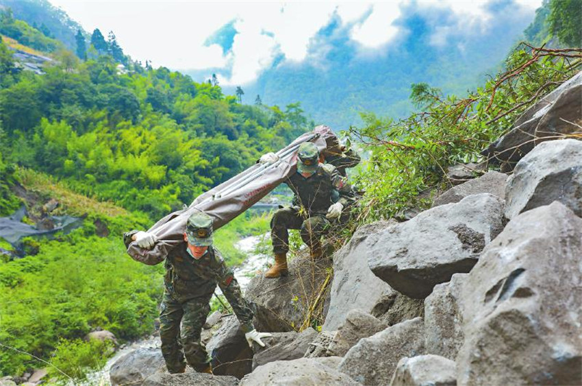 9月8日,雅安消防員在轉(zhuǎn)移石棉縣躍進(jìn)村一名癱瘓老人時(shí)遇到道路中斷,他們用身體建起一座“人橋”,讓隊(duì)友踩在肩背上將老人成功轉(zhuǎn)移到安置點(diǎn)。