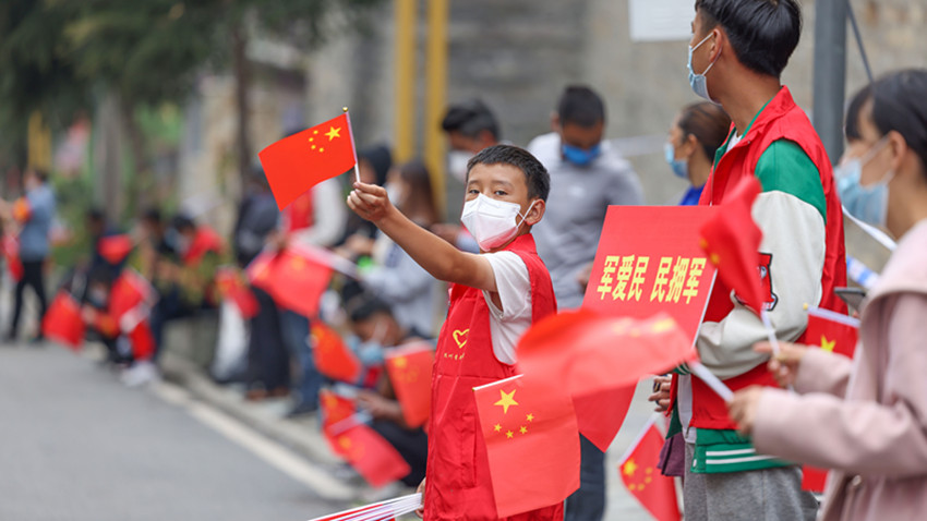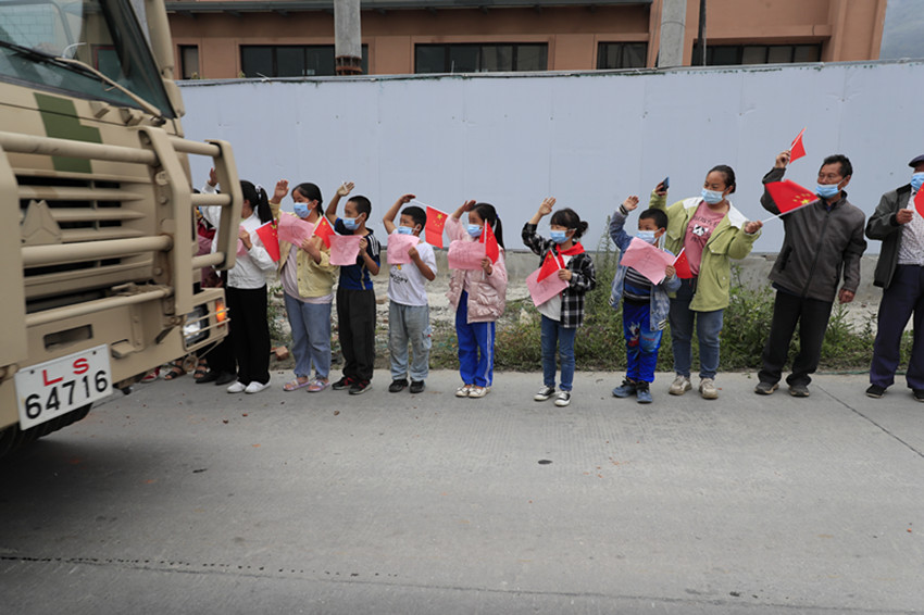 在磨西鎮(zhèn)大坪安置點(diǎn),受災(zāi)群眾送別救援隊(duì)伍。 張建國(guó) 攝