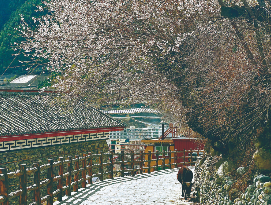 進入寨子大門,看到路兩旁、地坎上和藏房四圍有粉白的山桃花盛開。顧不得放下背包,便走向干凈整齊的村道,有三三兩兩的老人坐在院門外吃清茶、吸葉子煙。幾頭黃牛甩著尾巴從一塊草坪上走來,四蹄子有節(jié)奏的跺打著瀝青路面,聽到水聲,它們一齊把頭埋在了路旁的一條沿溝邊啜飲清水,嘴角發(fā)出了吱吱的暢飲聲。