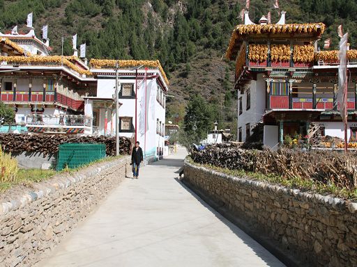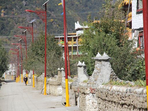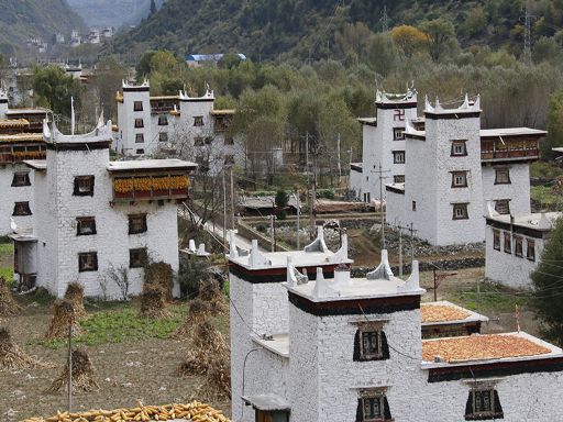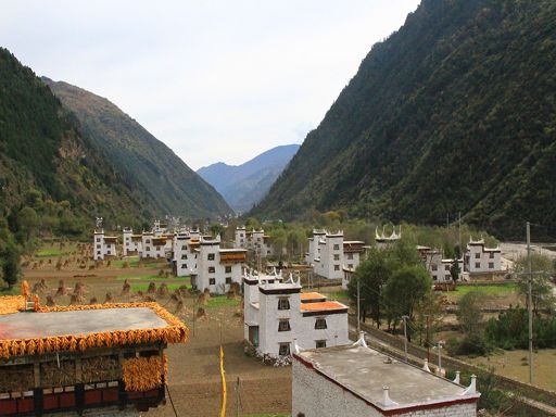走進冬日的丹巴縣革什扎鄉(xiāng)三道橋村,一幅如詩如畫的鄉(xiāng)村美景映入眼簾:一排排新穎別致而獨具嘉絨特色的白色藏房鑲嵌在彎彎的革什扎河旁,格外耀眼。一條條平直寬敞的硬化路像一根根潔白的哈達連接家家戶戶,寬敞平坦的公路上,轎車、農用車、拖拉機穿梭來往,別具一格的村民活動中心紅旗迎風飄揚。 這是如今的三道橋民族團結新村。
