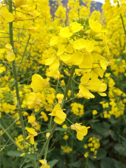 油菜花是我兒時的記憶,外婆為了生計,總會在家門口的幾畝菜地里滿滿當(dāng)當(dāng)?shù)姆N上油菜,菜花開的時候,我就會端上一根長板凳、一根方板凳坐在油菜花前寫作業(yè),油菜花的清香伴我度過了整個童年。記得兒時,每逢春季,田野里都會被一簇一簇的油菜花裝扮的金黃,大片的花兒披著一層金裝,偶爾一陣清風(fēng),大地上便掀起了片片的漣漪,烈陽下金光燦燦,甚是好看!