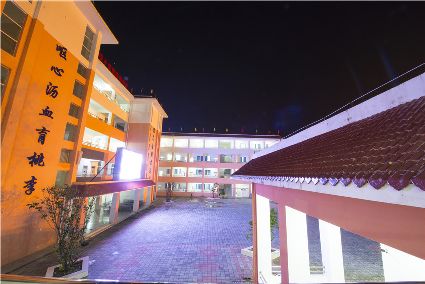 走進(jìn)暮色中,華燈初上,夜幕下的寄宿制學(xué)校更加美麗。具有幾何構(gòu)成美感的教學(xué)樓鐫刻著寒來暑往生琴書,嘔心瀝血育桃李。