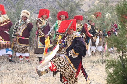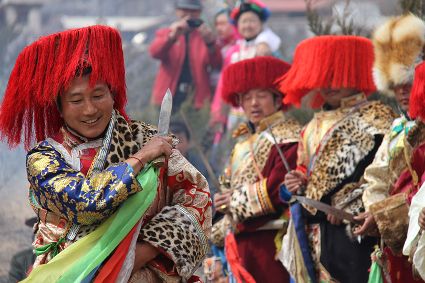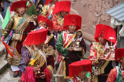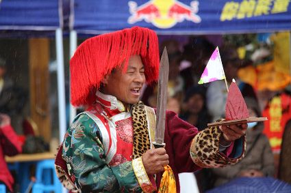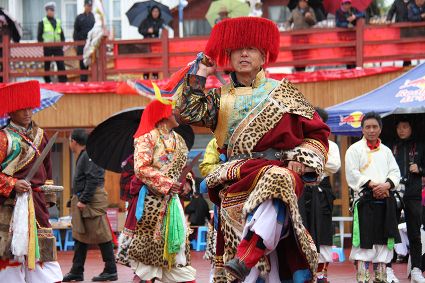 除了歌舞文化,德欽還是民俗文化最大的平臺,神山祭祀是村村寨寨必不可少的活動(dòng),在德欽,藏民對山水自然賦予了靈性,認(rèn)為自然也是和人一樣有著生命和靈性,尊重自然演繹出神山祭祀活動(dòng)豐富多彩?!暗顿潯?藏語稱“百諧”。在德欽農(nóng)村,刀贊是祭祀活動(dòng)的重頭戲,這一天,不亞于一個(gè)盛大的服飾表演。相傳“百諧”是古時(shí)村民為消除戰(zhàn)亂,祈福平安的一項(xiàng)傳統(tǒng)祭祀活動(dòng),延續(xù)至今已經(jīng)成為一項(xiàng)傳統(tǒng)的民俗活動(dòng)。“百諧”既是祭祀活動(dòng)的一個(gè)儀式,也是一個(gè)獨(dú)立的傳統(tǒng)民俗活動(dòng),村里每戶一男丁在這一天必須參加“百諧”?!疤K夏”是村里男人戴的最為隆重的帽子,他不同于金邊帽和狐皮帽。長刀是“刀贊”的道具, “吉祥的日子里,我們一敬天地,賜給我們帶來幸福的生活;再敬尊敬的共產(chǎn)黨,為我們帶來平安吉祥;三敬慈祥的雙親,教會(huì)我們?nèi)绾巫鲆粋€(gè)好人……”朗朗上口的說詞伴著閃閃的刀光起舞,頗具康巴壯士的英武陽剛。