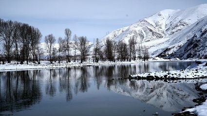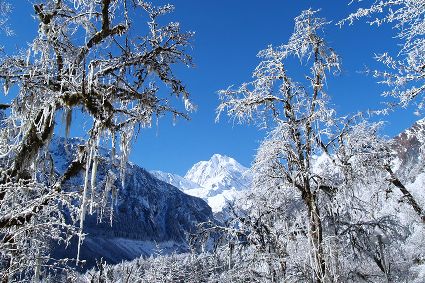 還留在枝頭上的綠色已被簇簇白雪點綴著,銀色的薄霧一重一重,遠處雪峰皚皚,冰川閃爍、青山融融、波光粼粼。