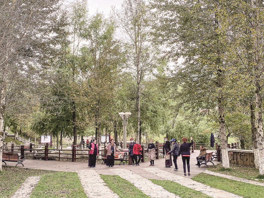 圖為老人們?cè)谇楦韫珗@跳廣場(chǎng)舞。記者 格桑土登 攝
