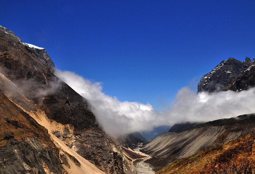 第二天,我們準(zhǔn)備游玩燕子溝,醒來的第一件事就是拉開窗簾看看天氣,又一陣興奮,天氣依然非常晴朗,今天是進(jìn)燕子溝的第一天,我早做足了準(zhǔn)備,太陽帽、墨鏡、食品等等一樣不少。從磨西到燕子溝溝口的路程很長,需要坐景區(qū)的觀光車,因?yàn)樘鞖獾脑颍缴现挥猩傩┰旗F繚繞,環(huán)在山腰,仿佛是一幅山水畫景。我們先來到了冰窖口,這里的海拔有三千多米,所幸大家都沒有高原反應(yīng),后坐車下山,來到有“定海神針”之稱的一棵高大筆直的杉樹。這棵杉樹皮粗厚,已經(jīng)沒有了樹葉,樹枝也寥寥無幾,更顯滄桑。站在樹下遙望,顯得人是那么渺小。不禁讓人遐想這顆千年古樹的滄桑歷史。然后開始步行游玩,這里海拔比較低,走 起來不是很累,在城市中見慣了高樓大廈,車水馬龍的我們,此刻真有一種離開凡塵,來到世外桃源的感覺,我們一路依山而上,越走越高。我們終于來到了天藥水坪,這里的景色已經(jīng)完全不同于山下,看著遠(yuǎn)處的山,我們都不約而同地“哇”了一聲。