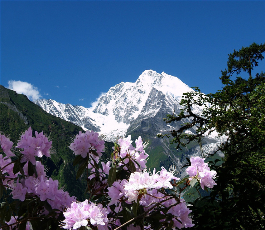 從海螺溝翻越雅家埂到康定的道路兩旁有很多品種的杜鵑花,埡口海拔1000米下生長(zhǎng)的杜鵑花樹高大,以緋紅色、粉紅色、紫色為主。海拔越高,花樹越矮,從山頂?shù)缴窖恢变佒氖前咨幕ǘ?,像是交織在山野的白花地毯?/p>
