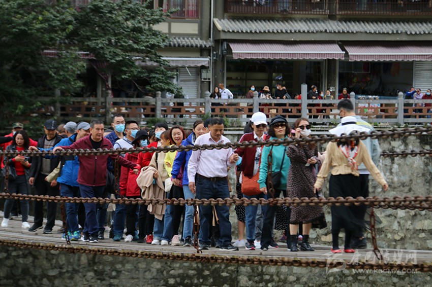 游客體驗瀘定鐵索橋。本網資料庫圖