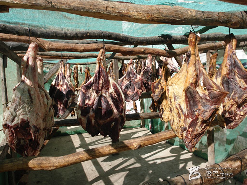 丹巴嘉絨藏族年期間,在酸菜包子、火燒饃、香豬腿等眾多的風(fēng)味飲食中,“藏香豬腿”是必不可缺的美食佳肴,也是給長輩拜年和親朋好友間互送的最佳禮品。“藏香豬腿”的制作方式也象丹巴嘉絨藏族年一樣的獨特。丹巴人宰殺年豬的方式通常有用繩索死吊或者用刀從勁入殺心臟致死兩種,現(xiàn)在采用后一種方式宰殺豬居多。當(dāng)?shù)厝藢⒇i宰殺后用熱水燙,處理好豬毛,再在胸口用刀開一孔,將手伸人胸腔扯斷心肺連接處,然后將其剖開,并把肥、瘦豬肉分離開,剝?nèi)グ逵?,處理好其他?nèi)臟,將豬腿按原形分離,爾后經(jīng)霜凍、柏枝熏、自然風(fēng)干后存放在儲藏室內(nèi)。豬腿存放一冬后,色、香、味俱佳。食用時煮成半熟或用炭火將表皮烘烤,切成小塊狀或撕成粉絲狀,在百米內(nèi)即可聞到香味,入口鮮嫩清香,營養(yǎng)豐富,誘人食欲。