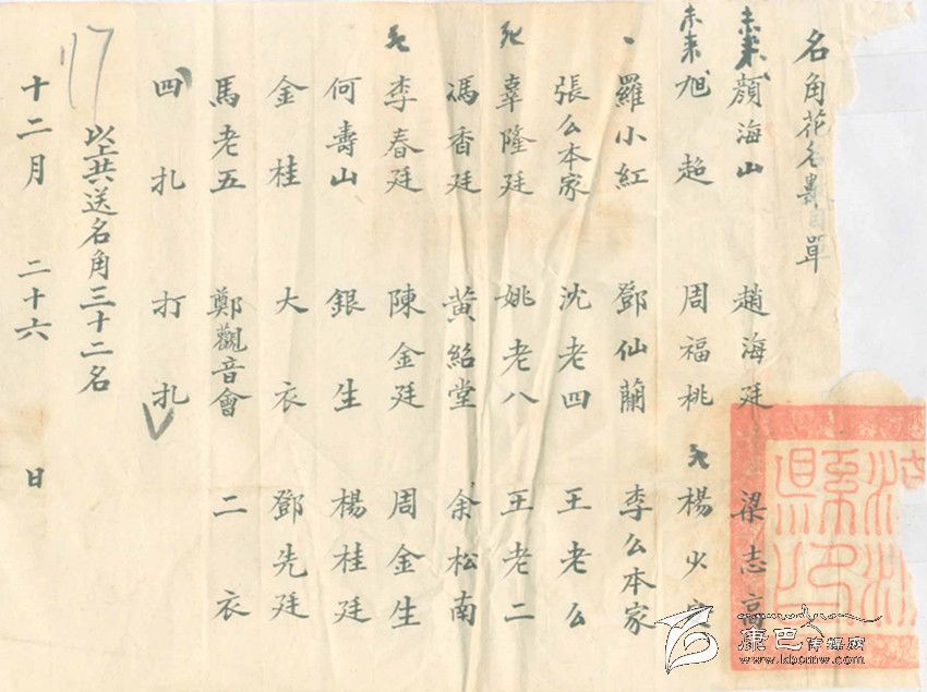 不準賭博做什么呢?當時的當權(quán)者還是費了一番心思,他們從外地請來了一個川戲班子,為了吸引人們關(guān)注,康定縣政府把戲班的名角以及配角演員名單寫成海報張貼到街頭,又抄成傳單廣為散發(fā),用現(xiàn)在的話說是,做足了戲班出場前的前期宣傳工作。從名單上看,這是一個不小的戲班子,所謂名角竟有32名之多。想來對于沒有多少文化生活的康定民眾,還是有一定的吸引力。