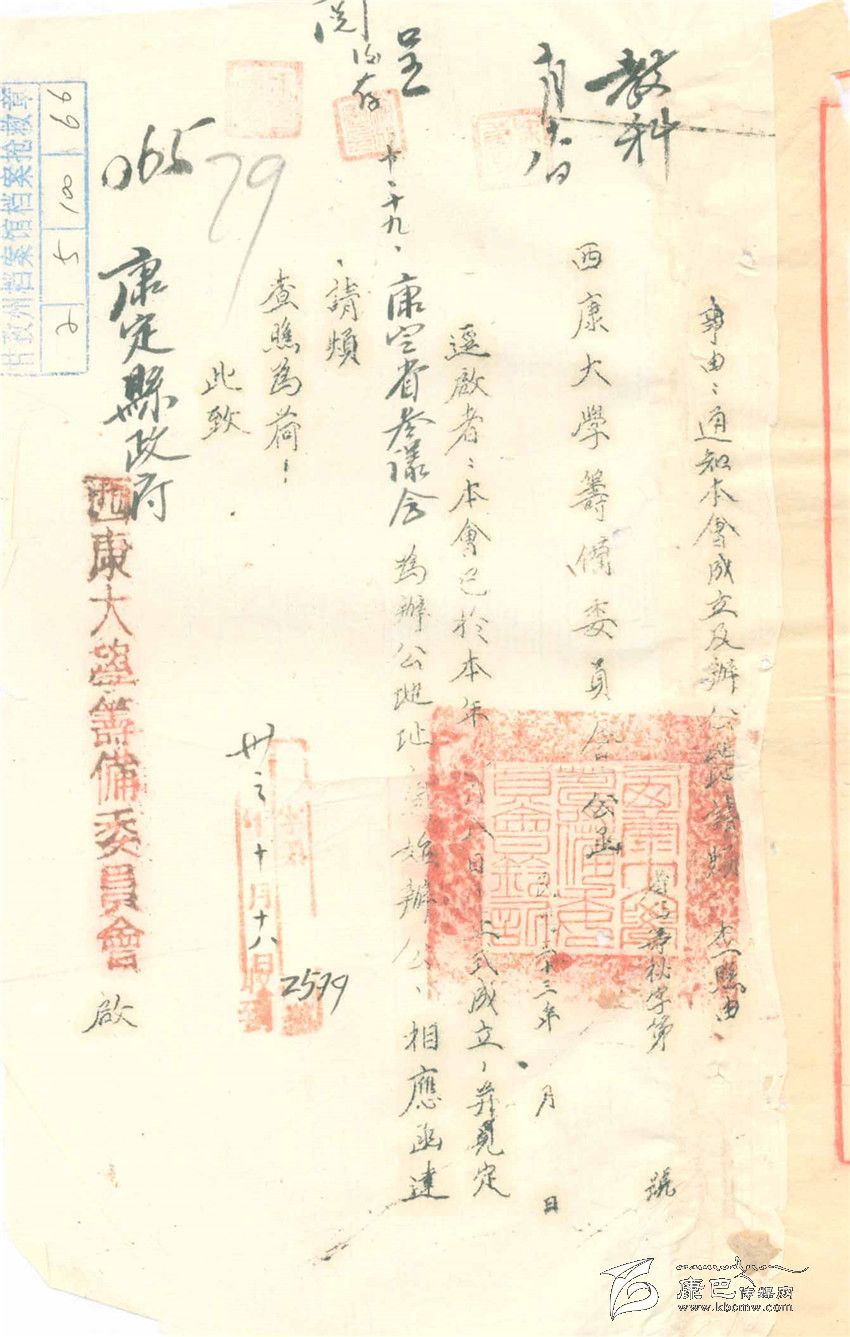根據(jù)這份資料上“教科:10月18日”和“呈閱后存:10月19日”等字樣推算,這個“西康大學籌委會”可能是在10月8日成立的,這份函件是送往康定縣政府,告知“籌委會”辦公地點的一般函件。