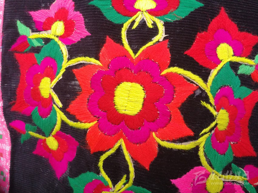 在這里,婦女們猶愛(ài)花草。所以,他們的刺繡作品,有生活的細(xì)節(jié)滲透,如氣息,若有似無(wú),相互浸潤(rùn)。無(wú)論是花蔓纏枝,還是朵花團(tuán)簇,都從生活中提煉,視之便信手拈來(lái),放在青布黑衫之上,鮮艷奪目,張顯著生活在這方水土之上,人們獨(dú)特的審美情趣。