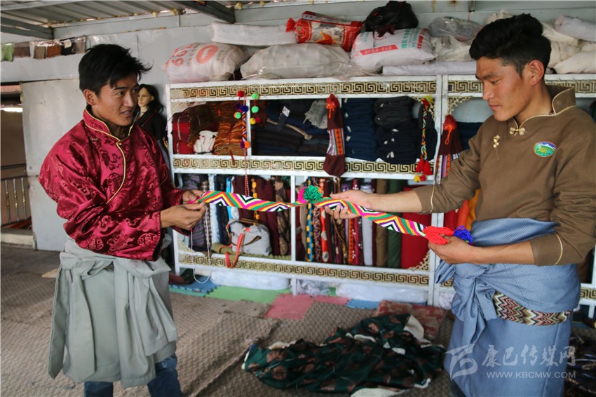 安孜鄉(xiāng)作為白玉縣海拔較高的鄉(xiāng)鎮(zhèn)之一,夏天是十分短暫的,連日來的晴好天氣,也透著絲絲寒氣。牧民阿剛想要量身定做一套過冬的藏裝,9月13日,他來到白玉縣阿察鎮(zhèn),一家民族服飾商貿(mào)公司吸引了他的目光。“我們這里的服裝面料是本地羊毛和從浙江進(jìn)的上等面料,做工考究,很多工序是純手工制作,服裝樣式你可以根據(jù)你的喜好指定,我們包你滿意。”店員仁真熱情地介紹。聽了仁真的介紹,阿剛用手捻了一下服裝用料的質(zhì)地,看到印有“祥陽措”商標(biāo)的精美包裝袋,商店里擺放的五彩斑斕、高端大氣的藏式男女服裝,他有些動心了?!吧a(chǎn)這些服裝的都是我們納塔鄉(xiāng)的牧民,你可以考察我們的服裝用料、生產(chǎn)流程,再作打算。”仁真熱情洋溢地介紹說。