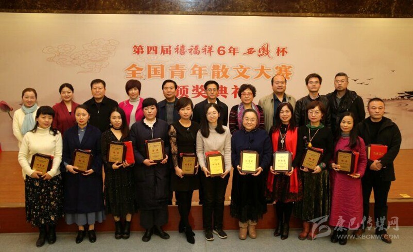 典禮在進(jìn)行最后的儀式,一群師范學(xué)院上臺領(lǐng)受了本屆青年散文大賽獲獎作品的合集《青春放歌》,這也是大賽堅(jiān)持了四年的傳統(tǒng)。陜西禧福祥品牌運(yùn)營有限公司董事長助理王子童代表董事長王延安宣布本屆大賽落幕,與此同時(shí),第五屆大賽正式啟動,并更名為“華語青年散文獎”,征集對象將面向所有華語散文青年作家。