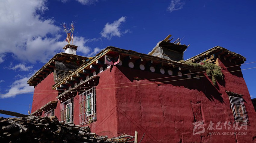 外裝飾也不繁復(fù)。外墻用磚紅色粘土調(diào)成泥漿上色,現(xiàn)在多用化學(xué)顏料。大門用一種叫“抓”的天然礦物質(zhì)涂料,這種顏料容易染色,挨一挨都會(huì)讓衣服沾上絳紅色,現(xiàn)在也用化學(xué)涂料代替。二樓與“砸口樓”檐口處裸露在外面的木頭,用漆絳紅色顏料涂抹,支出來的小圓木涂白色顏料。遠(yuǎn)遠(yuǎn)望去,紅白相間,錯(cuò)落有致,巴塘方言藏語稱之為“東椎”。檐口頂上用排成“人”字形的小青瓦點(diǎn)綴,窗框和門框都涂成絳紅色,也用“東椎”與青瓦裝飾;有條件的人家安裝雕花窗棱,嫌麻煩就用普通的大格子窗。外置庭院,種花植木,一座傳統(tǒng)的紅藏房便竣工了。