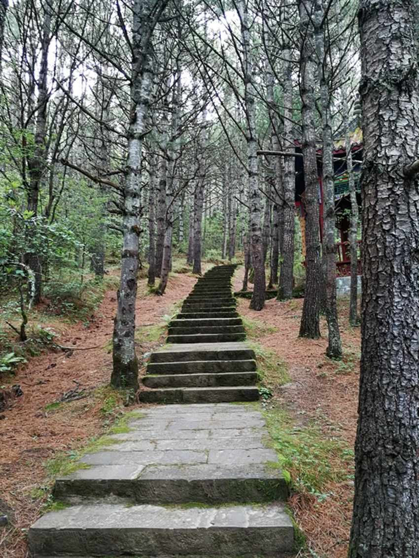 中國民俗有“大年初一不竄門”,這一天,康定人很多都會去寺廟燒香敬佛。前年大年初一,我便去了觀音閣。進門處,有專供燒紙錢的地方。再上階梯,有長列的白色佛塔,進寺就可點燈朝拜。出了觀音閣,我順道去找獅子巖。公路一側(cè)的堡坎已將原來的小徑斬斷,翻上堡坎,小徑幾乎已沒了蹤跡。再仰頭望,獅子巖已是掩映在濃密的綠樹雜叢間。長在右側(cè)的花椒樹,已不見蹤影。幾株高大的白楊樹遮天蔽日,最大的都長到盆口粗了?!鞍倌陿淠尽?,這無疑還是當(dāng)年那幾棵白楊樹了。我艱難地鉆過荒叢爬到獅子巖腳下,那“祭祀臺”上如過去一樣擺放有貢品,旁邊和樹枝上掛有經(jīng)幡,但周圍仍沒有一絲煙熏火燎過的痕跡。