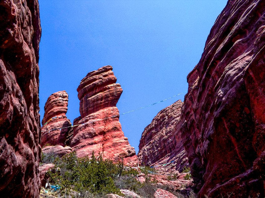環(huán)顧四周,滿目怪石如林、變化萬(wàn)千的紅山地貌群,巨大形狀的,如城堡或紅色的塔樓,或雄偉壯觀拔地而起石墻,陡峭直立的錐形物,小型的栩栩如生似鳥(niǎo)獸或人,有的像觀音、佛塔、吉祥海螺、金剛杵,有不少像藏族民間常用泥捏成的祭祀、祈禱用的“察察”,奇石異峰精巧豐富,星羅棋布。