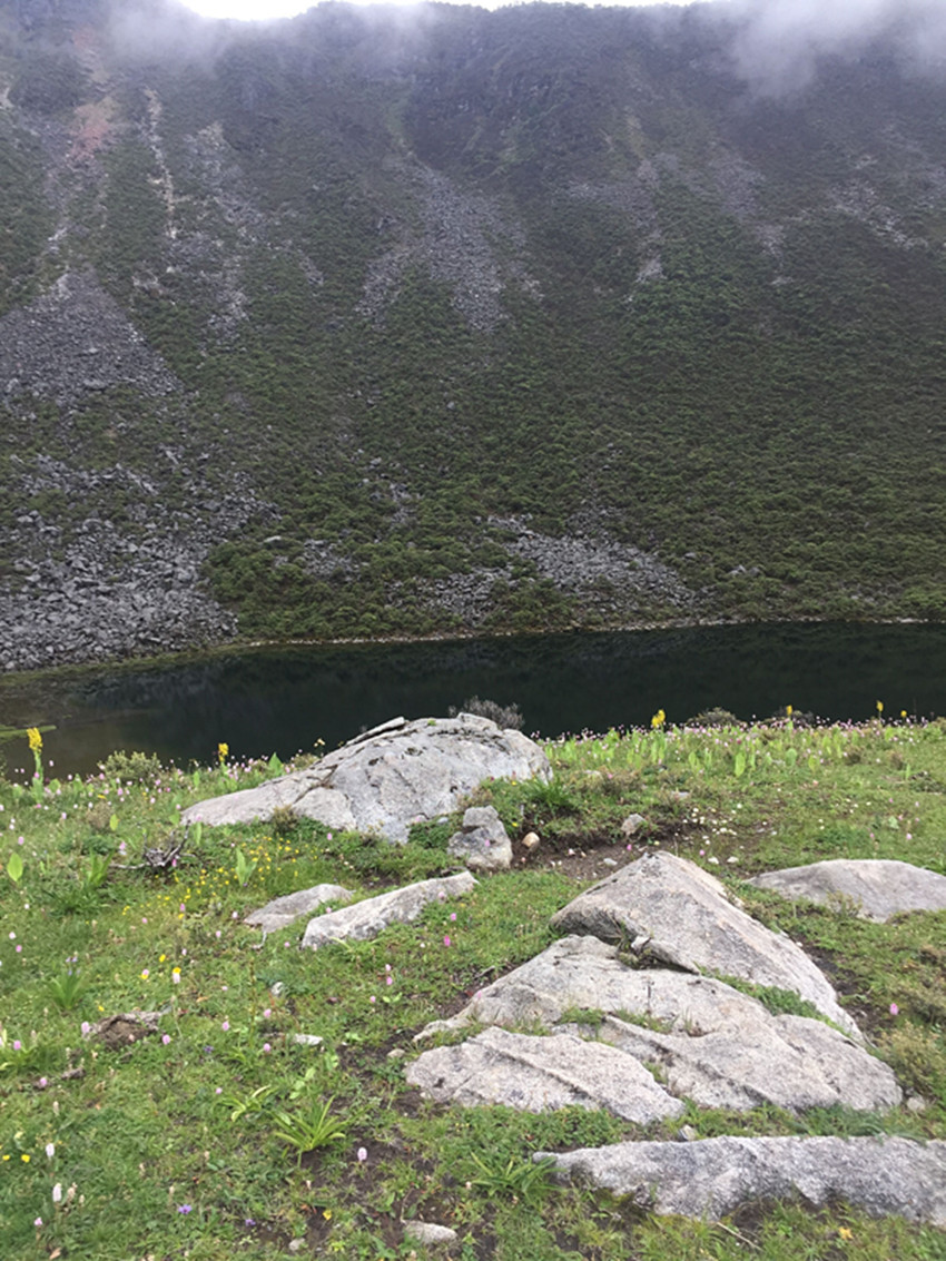 銀珠聽到南吉即興唱出的山歌那么溫婉動人,被風吹冷的眼睛里落下了兩顆溫熱的淚水。她掩飾住自己的情緒,從粗重的呼吸里回答:“好??!”南吉聽到銀珠對唱,臉上綻放出笑容。她們的腳底不再發(fā)出響聲的時候,就是已經(jīng)走到了兩座大山之間的那片山谷。一層淺雪里露著青草、一叢叢開紫花的小杜鵑,還有密密匝匝的矮腳柳。銀珠站在一塊土包上,她打開雙臂,一臉明媚地對著南吉說:“阿姐,這片沒有積雪的山谷就是我送給你的禮物?!?/span>