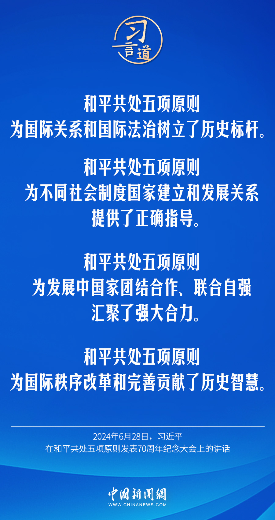 “面對(duì)和平還是戰(zhàn)爭(zhēng)、繁榮還是衰退、團(tuán)結(jié)還是對(duì)抗的歷史抉擇,我們比以往任何時(shí)候都更加需要弘揚(yáng)和平共處五項(xiàng)原則的精神內(nèi)涵,朝著構(gòu)建人類命運(yùn)共同體的崇高目標(biāo)不懈努力?!?月28日,習(xí)近平主席出席和平共處五項(xiàng)原則發(fā)表70周年紀(jì)念大會(huì)并發(fā)表重要講話。習(xí)主席在講話中,回顧總結(jié)了和平共處五項(xiàng)原則發(fā)表的歷史淵源、重要意義,深刻闡述了構(gòu)建人類命運(yùn)共同體理念的豐富內(nèi)涵、重要貢獻(xiàn),鄭重提出了推進(jìn)全球和平與發(fā)展事業(yè)的中國倡議,明確宣布了一系列更好支持“全球南方”合作的中國行動(dòng),再次向世界宣示了中國走和平發(fā)展道路的堅(jiān)定決心。