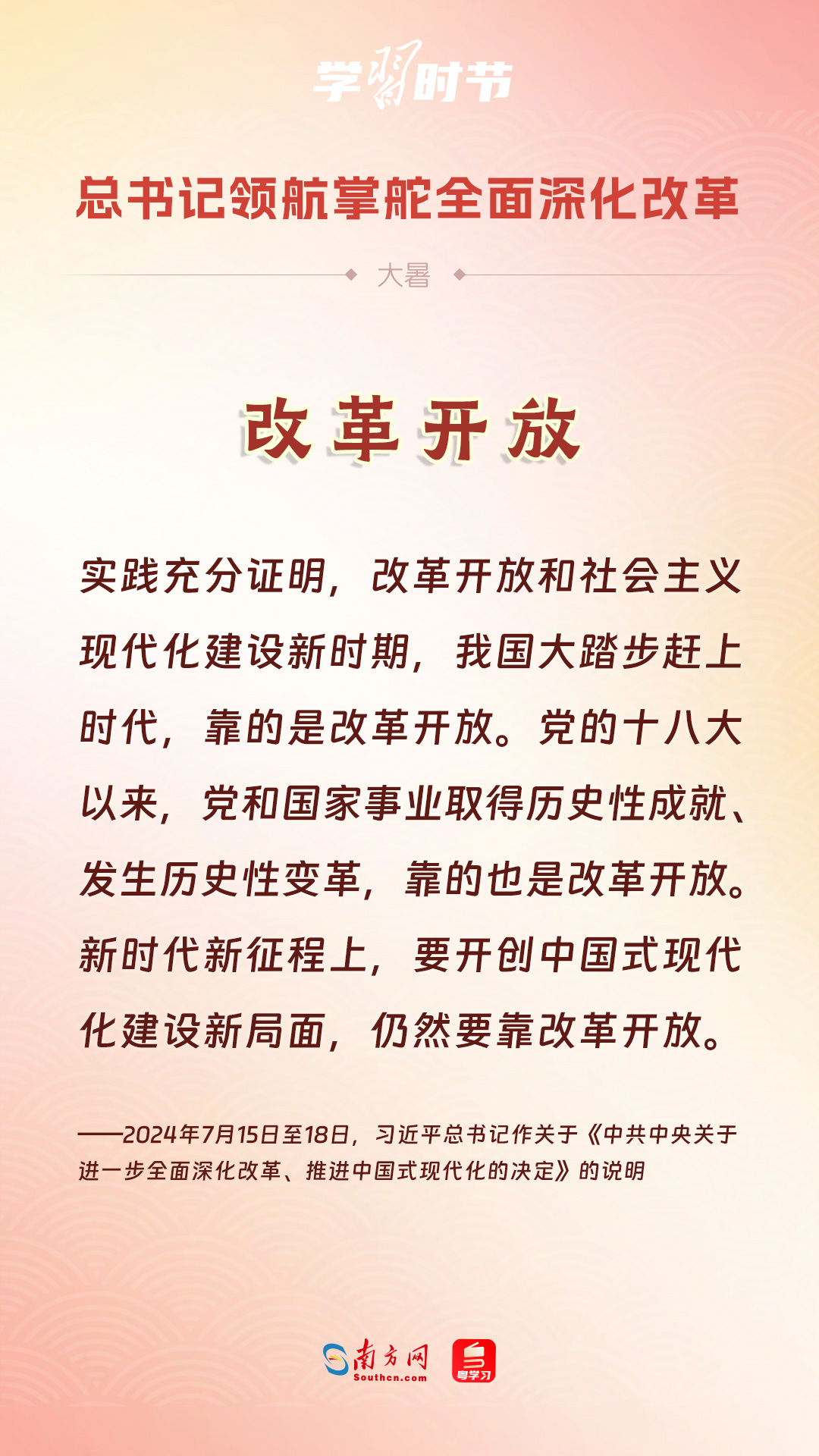 黨的十八大以來,習近平總書記親自領導、親自部署、親自推動全面深化改革工作,推動全面深化改革事業(yè)在攻堅克難中不斷邁上新臺階、取得新勝利。在驕陽似火的大暑時節(jié),通過一組海報,讓我們共同學習習近平總書記關于“全面深化改革”的重要論述。