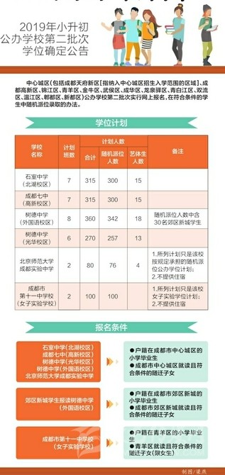6月17日,記者從成都市教育局獲悉,根據(jù)《成都市教育局關于2019年小學畢業(yè)生初中入學工作的通知》(成教函〔2019〕35號)規(guī)定,中心城區(qū)(包括成都天府新區(qū)[指納入中心城區(qū)招生入學范圍的區(qū)域]、成都高新區(qū)、錦江區(qū)、青羊區(qū)、金牛區(qū)、武侯區(qū)、成華區(qū)、龍泉驛區(qū)、青白江區(qū)、雙流區(qū)、溫江區(qū)、郫都區(qū)、新都區(qū))公辦學校第二批次(詳見學位計劃表)實行網(wǎng)上報名、在符合條件的學生中隨機派位錄取的辦法。網(wǎng)上申報時間為6月22日10:00至25日17:00;7月2日16:00,成都市招考辦將在服務平臺上載入派位結(jié)果,學校公布錄取學生名單。
