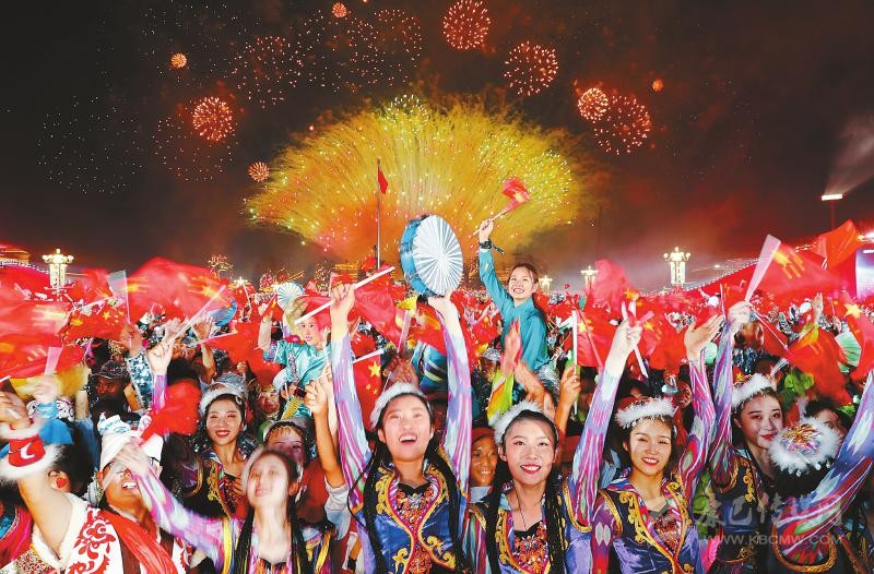 此刻,萬花綻放,“人民萬歲”造型照亮廣場,照亮每個人的臉龐。