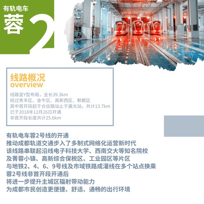 有軌電車蓉2號(hào)線工程線路呈Y型布局,線路經(jīng)過(guò)青羊區(qū)、金牛區(qū)、高新西區(qū)、郫都區(qū),線路全長(zhǎng)39.3km。其中首開(kāi)段起于合信路站,止于晨光站共計(jì)13.7km,已于2018年12月26日開(kāi)通,非首開(kāi)段長(zhǎng)度共計(jì)25.6km。