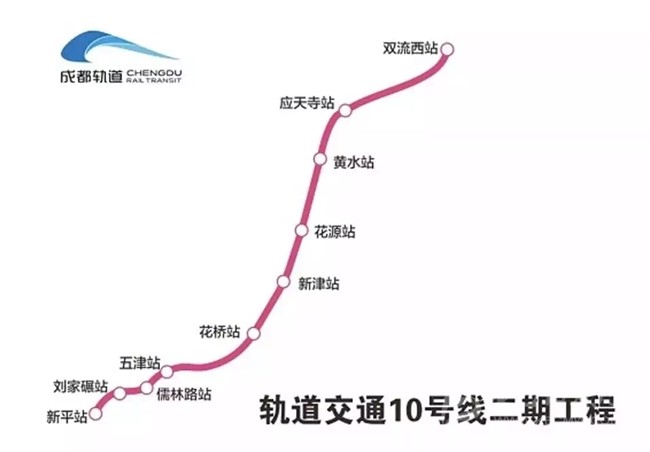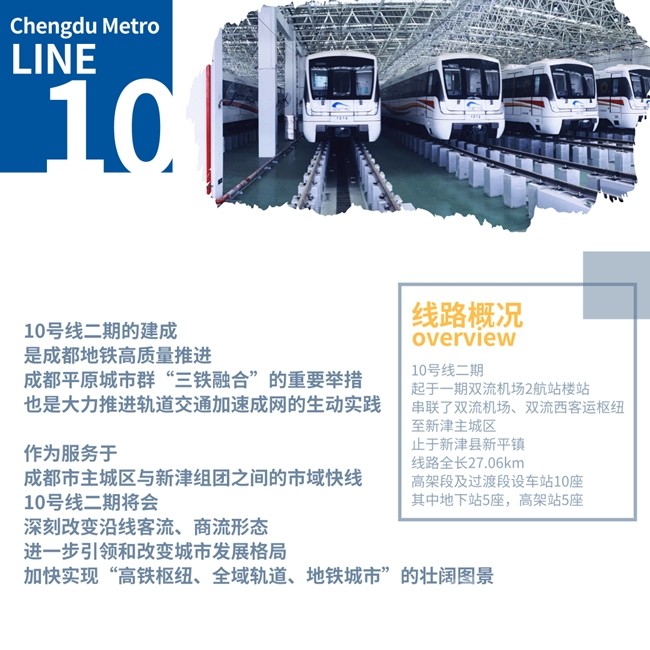 10號(hào)線二期起于一期雙流機(jī)場(chǎng)2航站樓站,串聯(lián)了雙流機(jī)場(chǎng)、雙流西客運(yùn)樞紐至新津主城區(qū),止于新津縣新平鎮(zhèn),線路全長(zhǎng)27.06km,高架段及過(guò)渡段設(shè)車站10座,其中地下站5座,高架站5座。