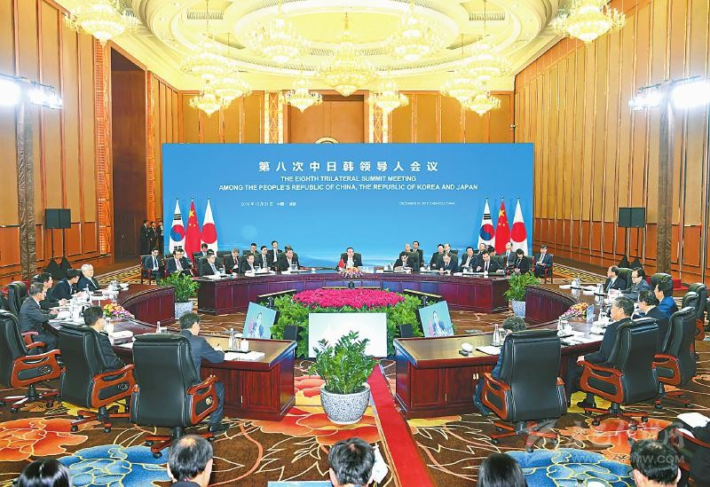 十二月二十四日,國務(wù)院總理李克強(qiáng)在成都與韓國總統(tǒng)文在寅、日本首相安倍晉三共同出席第八次中日韓領(lǐng)導(dǎo)人會(huì)議。新華社記者 張領(lǐng) 攝