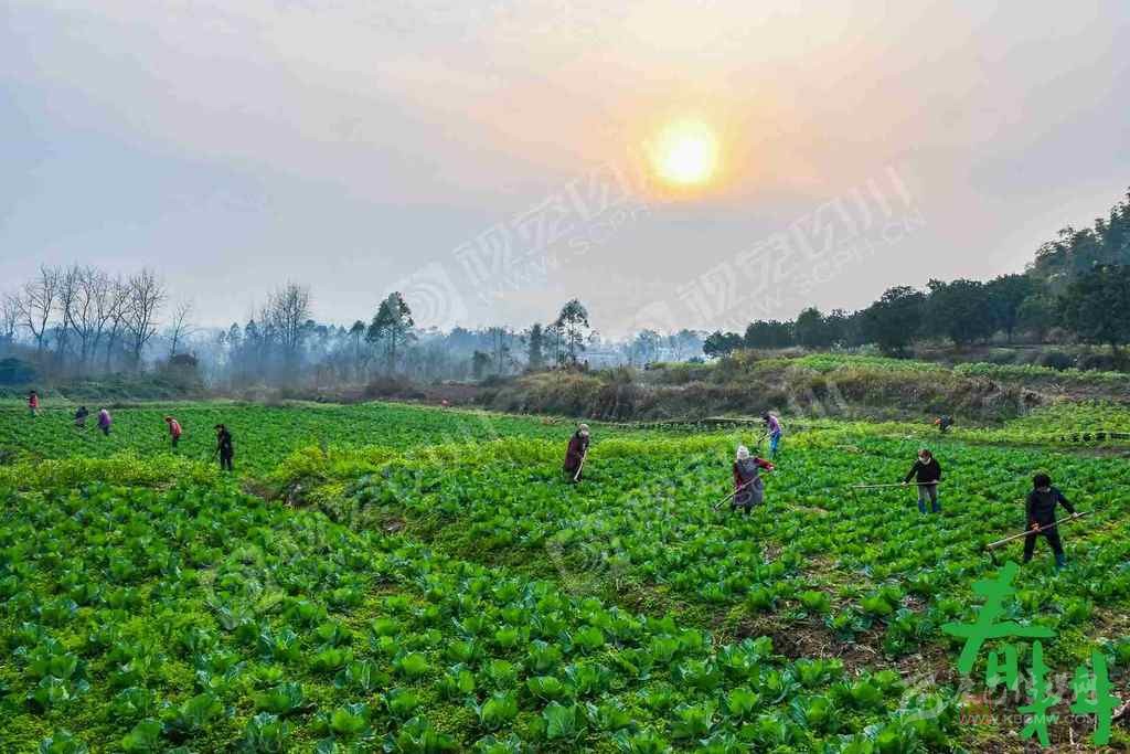廣安市廣安區(qū)大龍鎮(zhèn)光明村村民在甘藍地里春管除草。