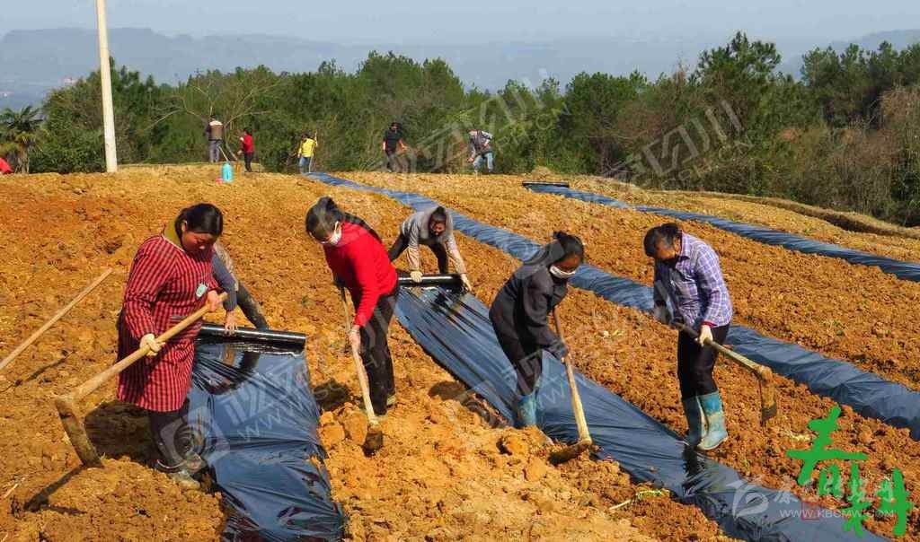 巴中市南江縣紅光鎮(zhèn)石寨村村民帶著口罩在開墾的荒坡地上開溝壘廂、覆蓋地膜,準備栽植茶苗。