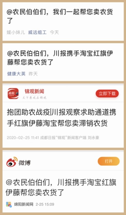 多地市州媒體及縣級融媒體中心的關(guān)注積極響應(yīng)參與活動。“網(wǎng)信四川”公眾號、南充日報“南充見”、成都日報錦觀、眉山在線、開江發(fā)布、直播鹽亭、綿陽新聞網(wǎng)、宜賓日報、威遠組工、健康大英等均及時對活動相關(guān)信息進行了發(fā)布,及時把抱團助農(nóng)戰(zhàn)疫活動信息帶給當?shù)赜行枨蟮霓r(nóng)戶。