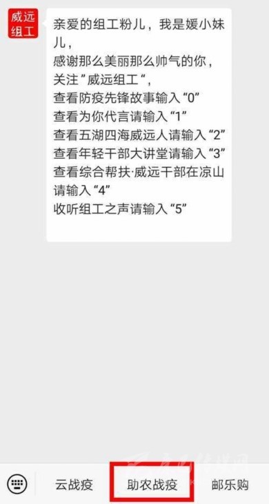 除了媒體之外,一些機關(guān)單位的政務(wù)新媒體也為活動“站臺”,“威遠組工”官方微信公眾號的底部菜單欄,特別新增了“助農(nóng)戰(zhàn)疫”專欄,直接連通川報觀察頁面,為當?shù)剞r(nóng)戶及農(nóng)業(yè)經(jīng)營戶提供解決難題的路徑。