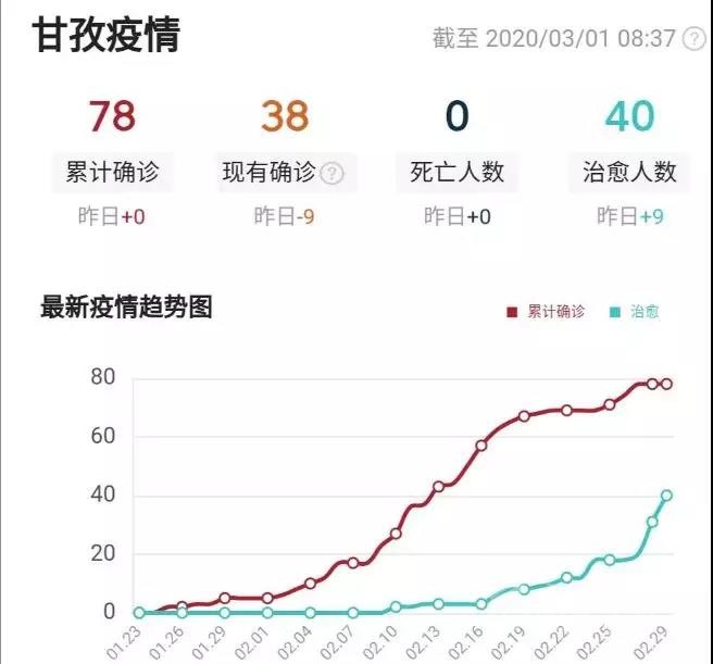 截至2月29日24時(shí),我州累計(jì)報(bào)告確診病例78例,累計(jì)治愈出院40人(道孚縣35人、康定市2人、色達(dá)縣2人、稻城縣1人),其余38人(重癥4例,危重癥1例)均在定點(diǎn)醫(yī)院隔離治療,231名密切接觸者正在接受醫(yī)學(xué)觀察。我州除道孚縣“五鄉(xiāng)一鎮(zhèn)”外,其余17個(gè)縣(市)連續(xù)26天無確診病例報(bào)告。