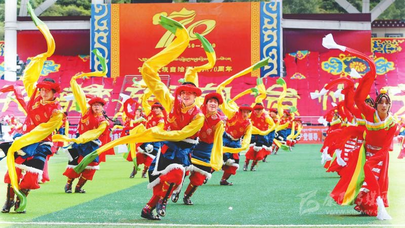 9月17日,甘孜藏族自治州成立70周年慶祝大會在康定舉行。各族群眾表演以“圣潔甘孜筑夢新時代”為主題的文藝節(jié)目。四川日報(bào)全媒體記者 歐陽杰 攝