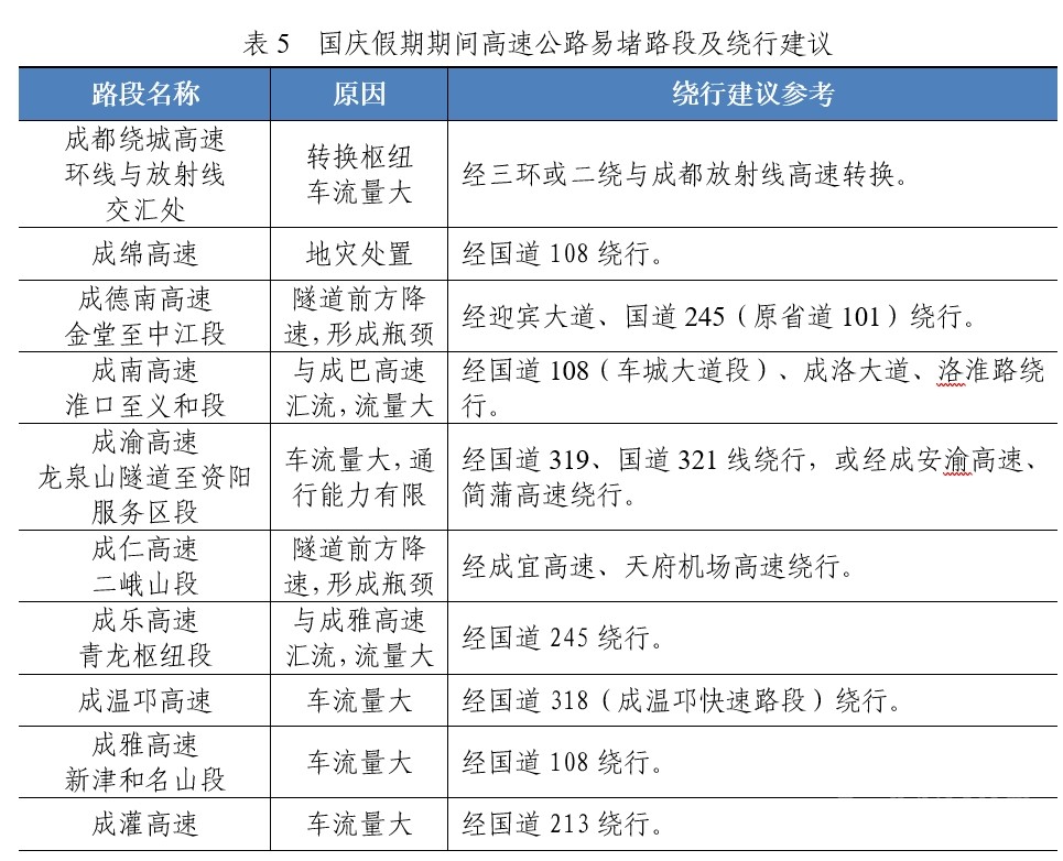 成都周邊高速出現(xiàn)擁堵可能性較大。成都繞東高速日均流量約19.02萬輛,遠(yuǎn)超設(shè)計流量。成溫邛、成都繞西、成雅、成彭、成南高速流量也將大幅提升,日均流量均超過10萬輛。此外,渝蓉、成綿、成灌等方向的路段車流量也較平日車流量增加明顯。