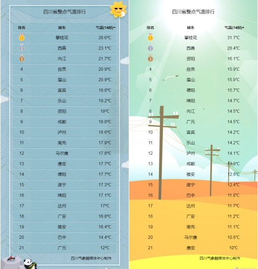 3月23日(左圖)與3月22日(右圖)四川各城市實(shí)況氣溫對比。