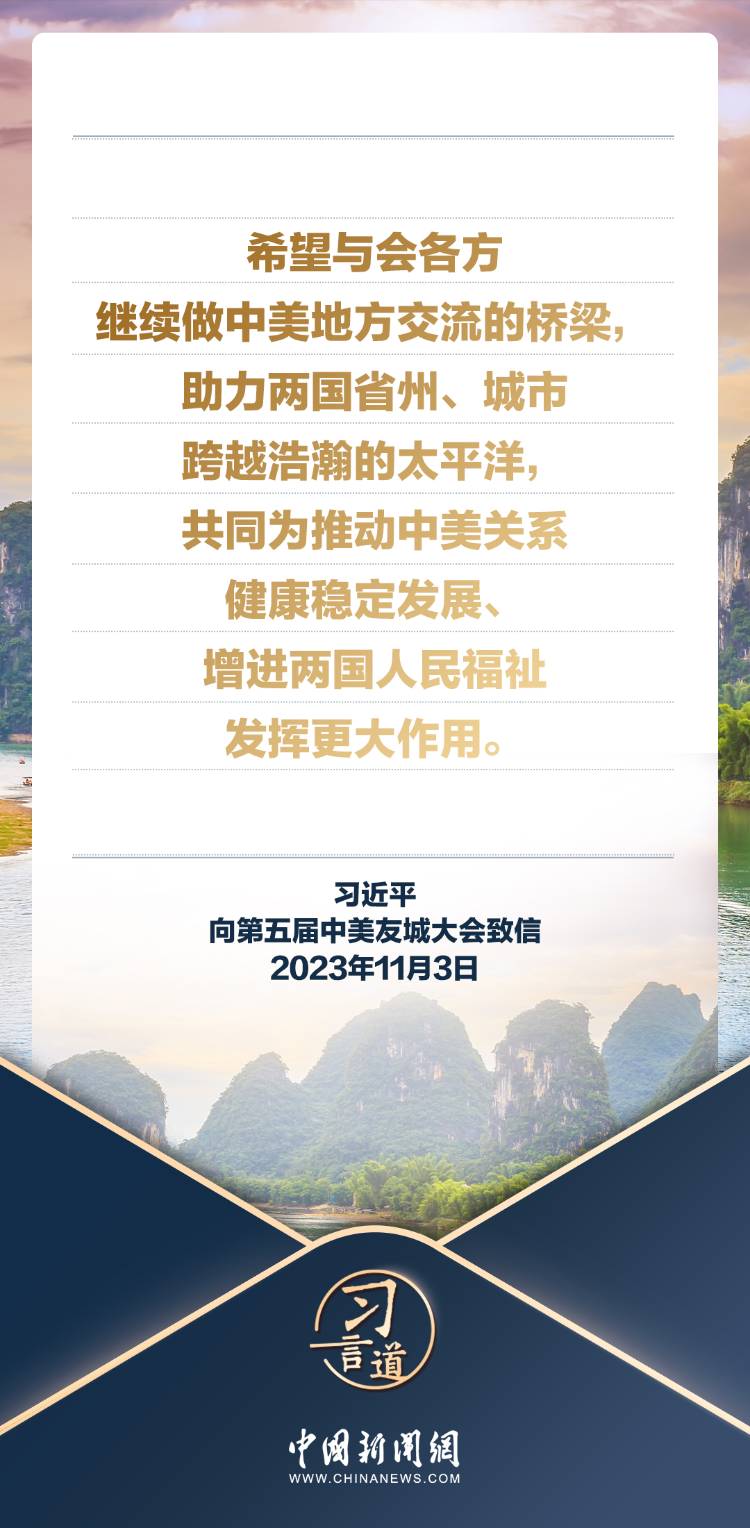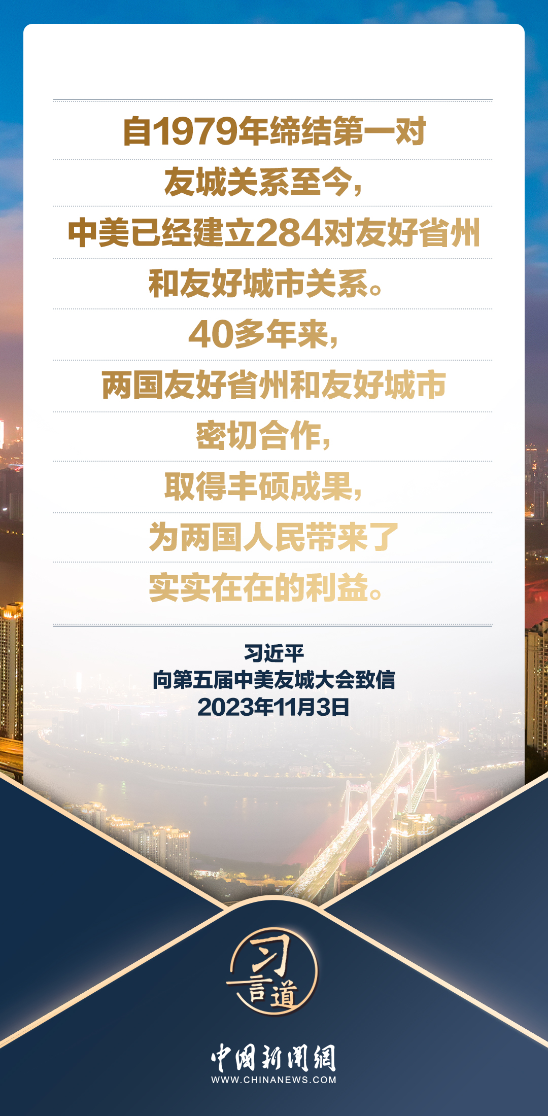 11月3日,國家主席習(xí)近平向第五屆中美友城大會(huì)致信。習(xí)近平指出——