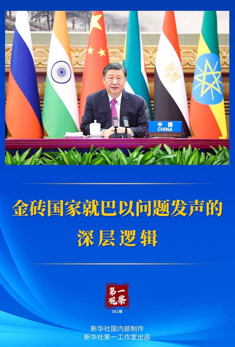 “當(dāng)前形勢下,金磚國家就巴以問題發(fā)出正義之聲、和平之聲,非常及時(shí)、非常必要?!痹谥v話中,習(xí)近平主席開宗明義。