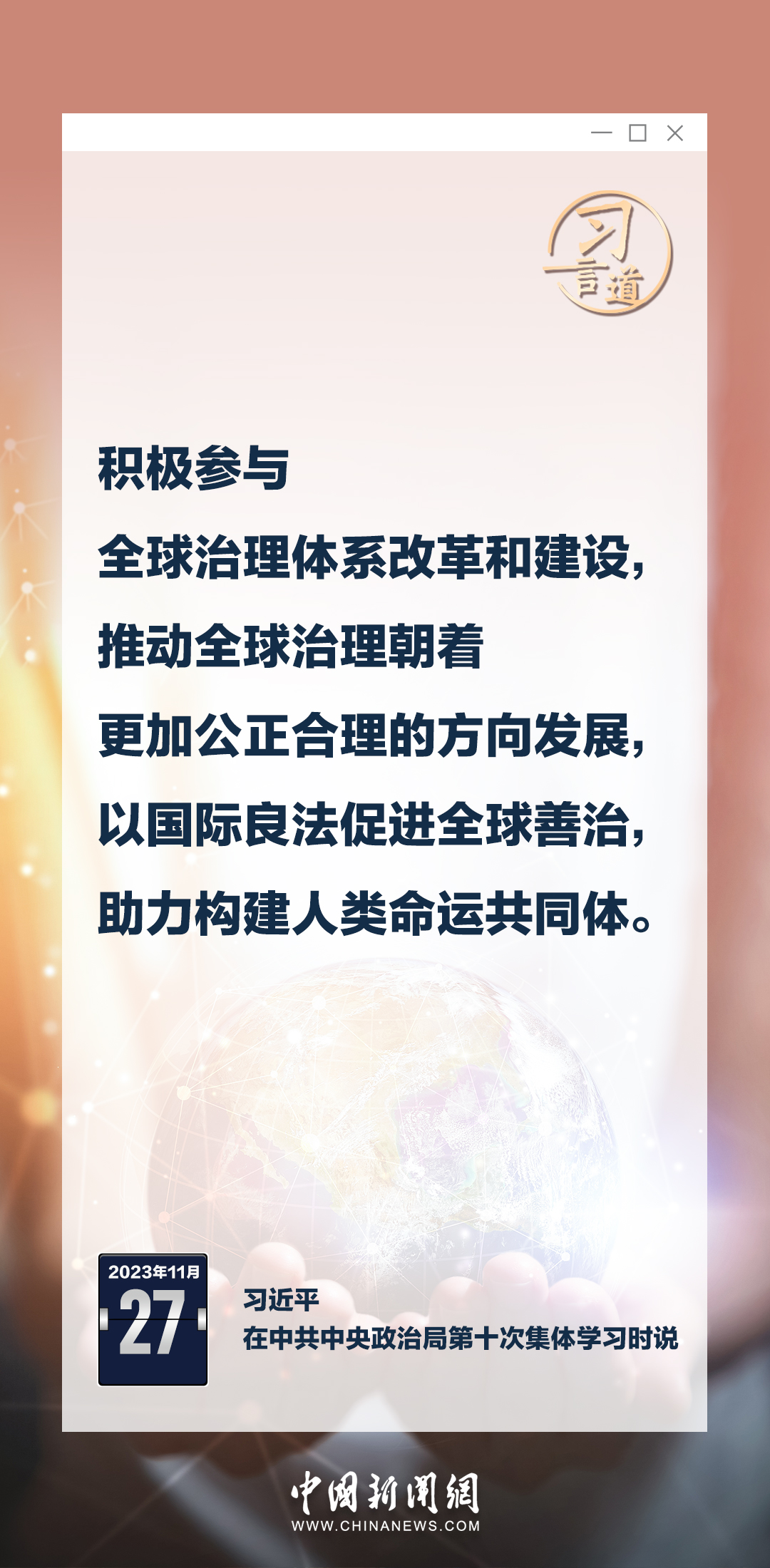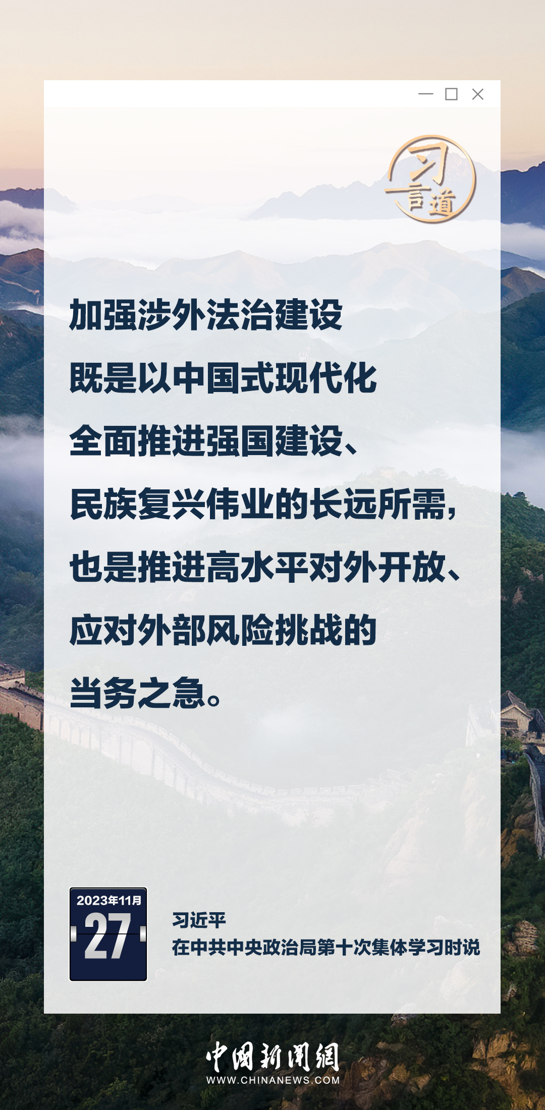 中共中央政治局11月27日下午就加強涉外法制建設(shè)進行第十次集體學(xué)習(xí)。中共中央總書記習(xí)近平在主持學(xué)習(xí)時強調(diào)——