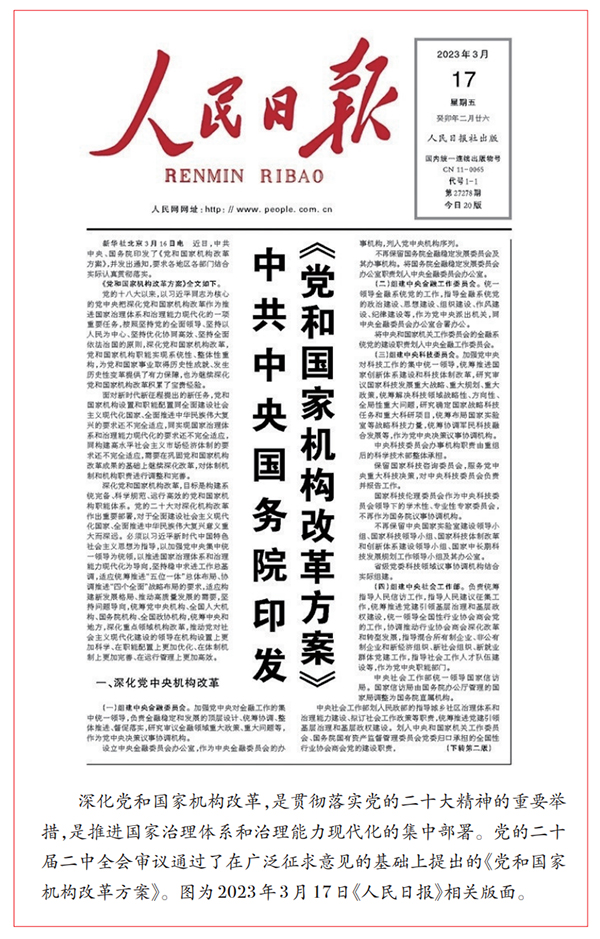 2023年2月,黨的二十屆二中全會(huì)審議通過《黨和國家機(jī)構(gòu)改革方案》,推動(dòng)黨對(duì)社會(huì)主義現(xiàn)代化建設(shè)的領(lǐng)導(dǎo)在機(jī)構(gòu)設(shè)置上更加科學(xué)、在職能配置上更加優(yōu)化、在體制機(jī)制上更加完善、在運(yùn)行管理上更加高效。