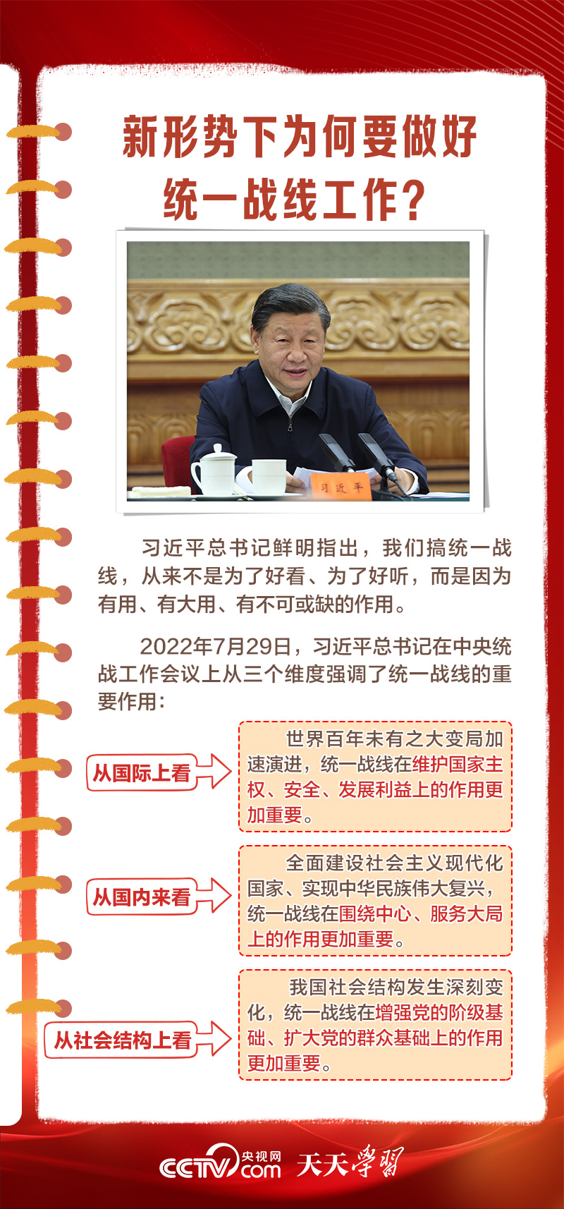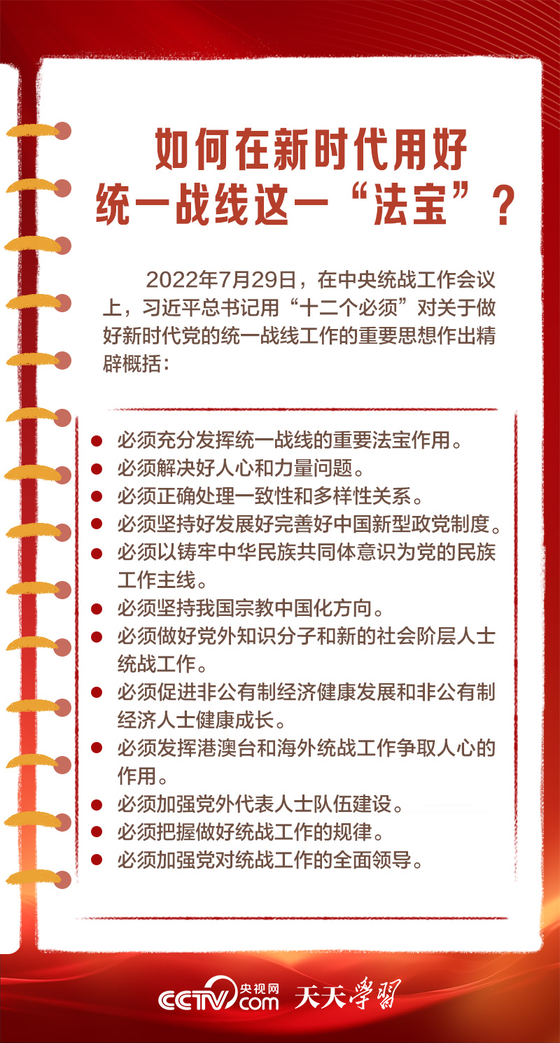 天天學習1月16日出版的第2期《求是》雜志發(fā)表了習近平總書記的重要文章《完整、準確、全面貫徹落實關(guān)于做好新時代黨的統(tǒng)一戰(zhàn)線工作的重要思想》,該文是習近平總書記2022年7月在中央統(tǒng)戰(zhàn)工作會議上講話的一部分。文章指出,統(tǒng)一戰(zhàn)線是黨克敵制勝、執(zhí)政興國的重要法寶,是團結(jié)海內(nèi)外全體中華兒女實現(xiàn)中華民族偉大復(fù)興的重要法寶,必須長期堅持。