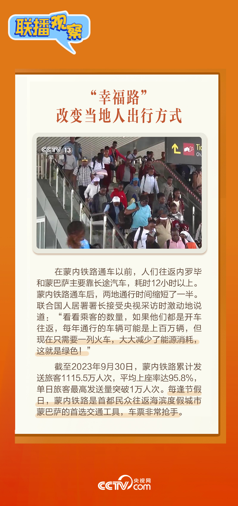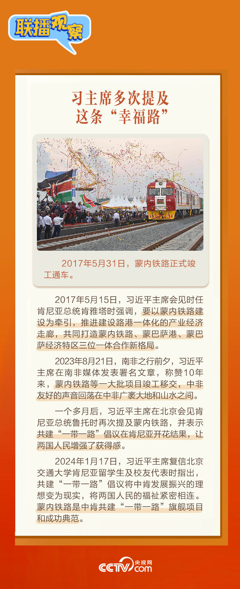 此前,習(xí)主席在外事活動(dòng)中多次提及蒙內(nèi)鐵路,《新聞聯(lián)播》也持續(xù)關(guān)注這條路的建設(shè)及開通后的運(yùn)營(yíng)情況。這條“幸福路”有何特別之處,習(xí)主席為何頻頻提及?它的建成通車給當(dāng)?shù)貛砟男┳兓??《?lián)播觀察》邀您一同了解。