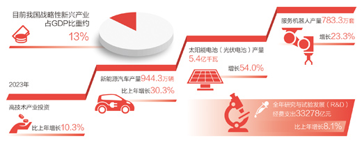 發(fā)展壯大戰(zhàn)略性新興產業(yè)?!皯?zhàn)略性新興產業(yè)具有創(chuàng)新活躍、技術密集等特點,為新質生產力發(fā)展壯大提供了巨大空間?!备呶拇碚f,近年來,我國戰(zhàn)略性新興產業(yè)蓬勃發(fā)展,目前戰(zhàn)略性新興產業(yè)占GDP比重約13%。