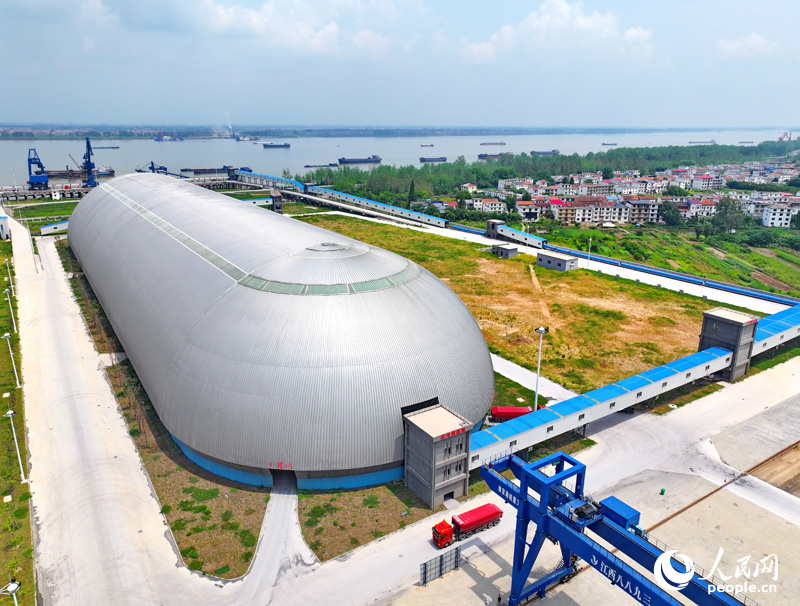 位于九江柴桑區(qū)的九江港赤湖作業(yè)區(qū)公用碼頭的“膠囊”倉庫,是全國第二個、江西首個新型智慧散貨碼頭。人民網(wǎng) 朱海鵬攝