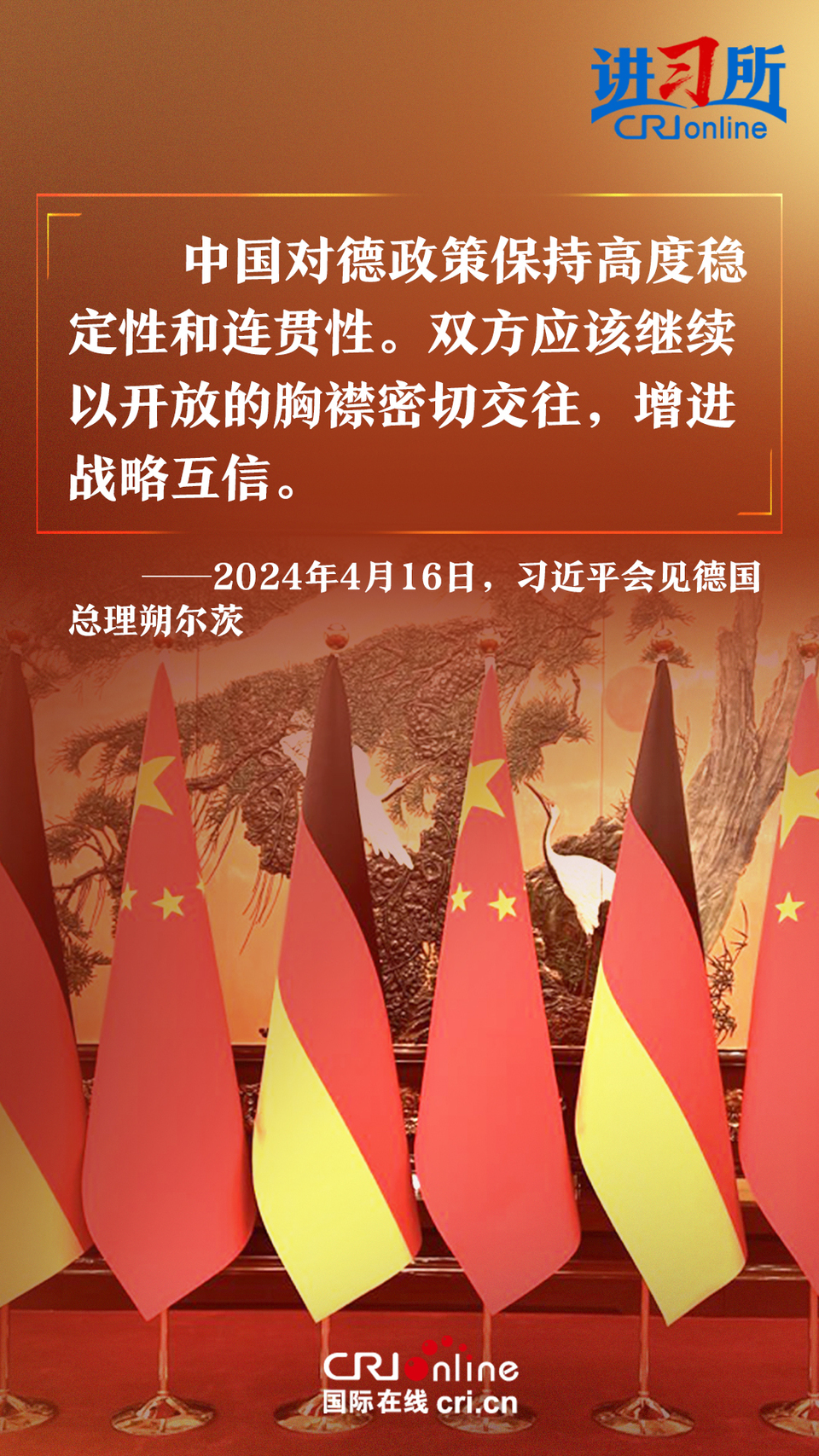 4月16日上午,中國國家主席習(xí)近平在北京釣魚臺(tái)國賓館會(huì)見了德國總理朔爾茨。習(xí)近平指出,中德合作對(duì)雙方有利,對(duì)世界有利。世界越是動(dòng)蕩,雙方越要提升兩國關(guān)系的韌性和活力。中德是世界第二、第三大經(jīng)濟(jì)體,鞏固和發(fā)展中德關(guān)系的意義超越雙邊關(guān)系范疇,對(duì)亞歐大陸乃至整個(gè)世界都有重要影響。兩國要從長遠(yuǎn)和戰(zhàn)略角度看待和發(fā)展雙邊關(guān)系,攜手為世界注入更多穩(wěn)定性和確定性。